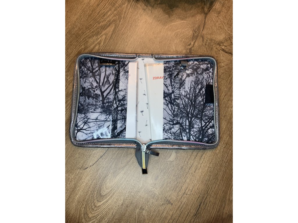 Obal velikosti cca 19 x 34cm - otevřený (v x š). Uvnitř na každé straně s látkovou kapsou a kapsou slídovou. Do každé látkové kapsičky dáte jeden zdravotní průkaz o rozměrech cca 15,5 x 11cm (v x š). Hloubka samotné slídové kapsy je cca 7,5 cm.